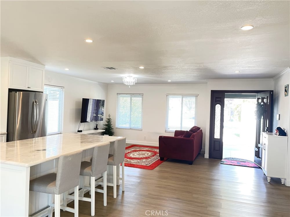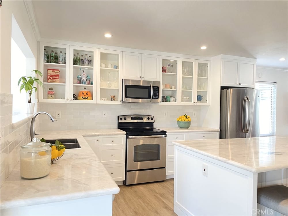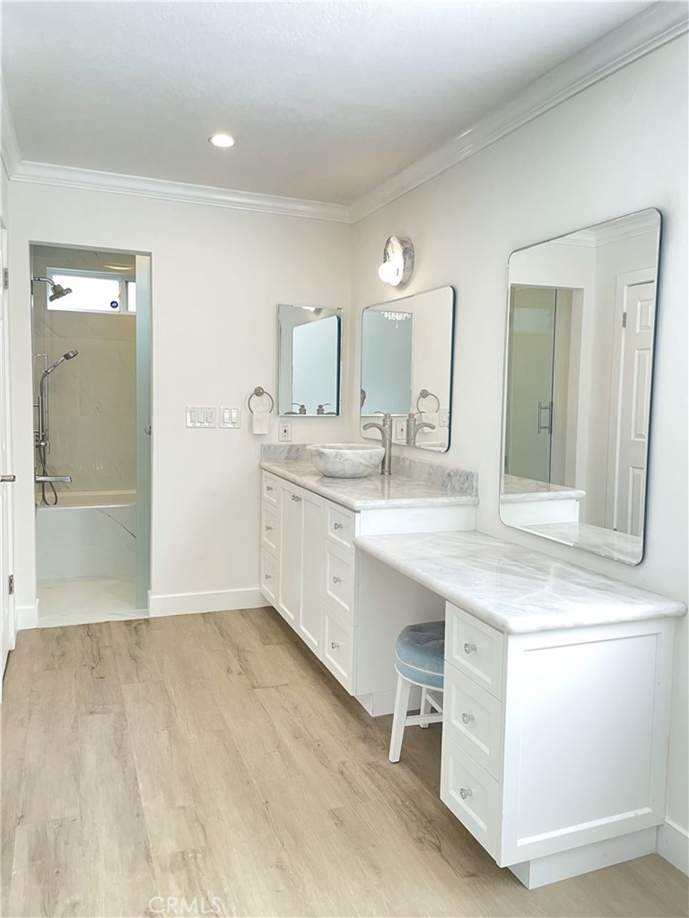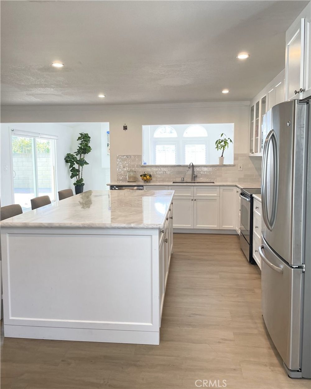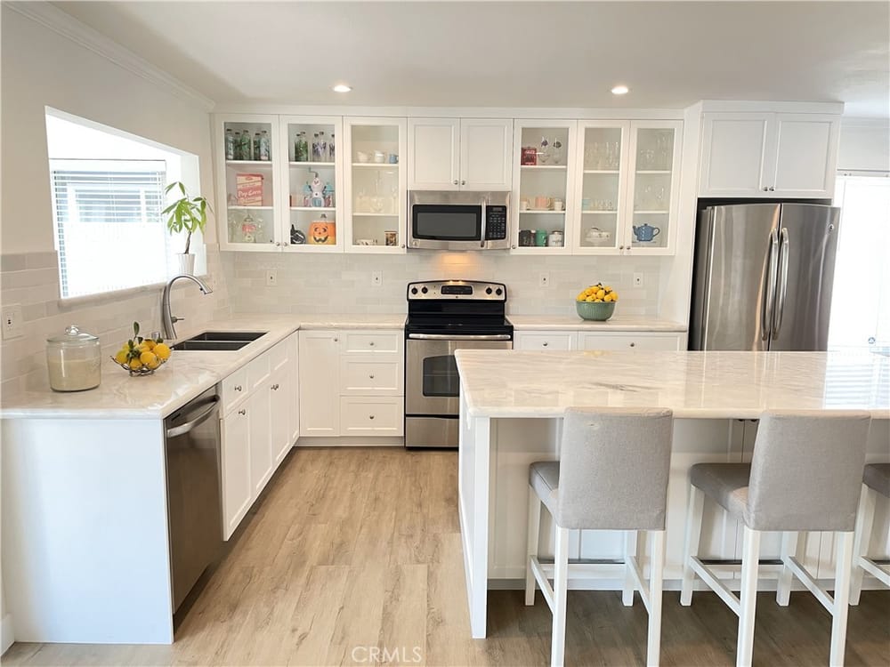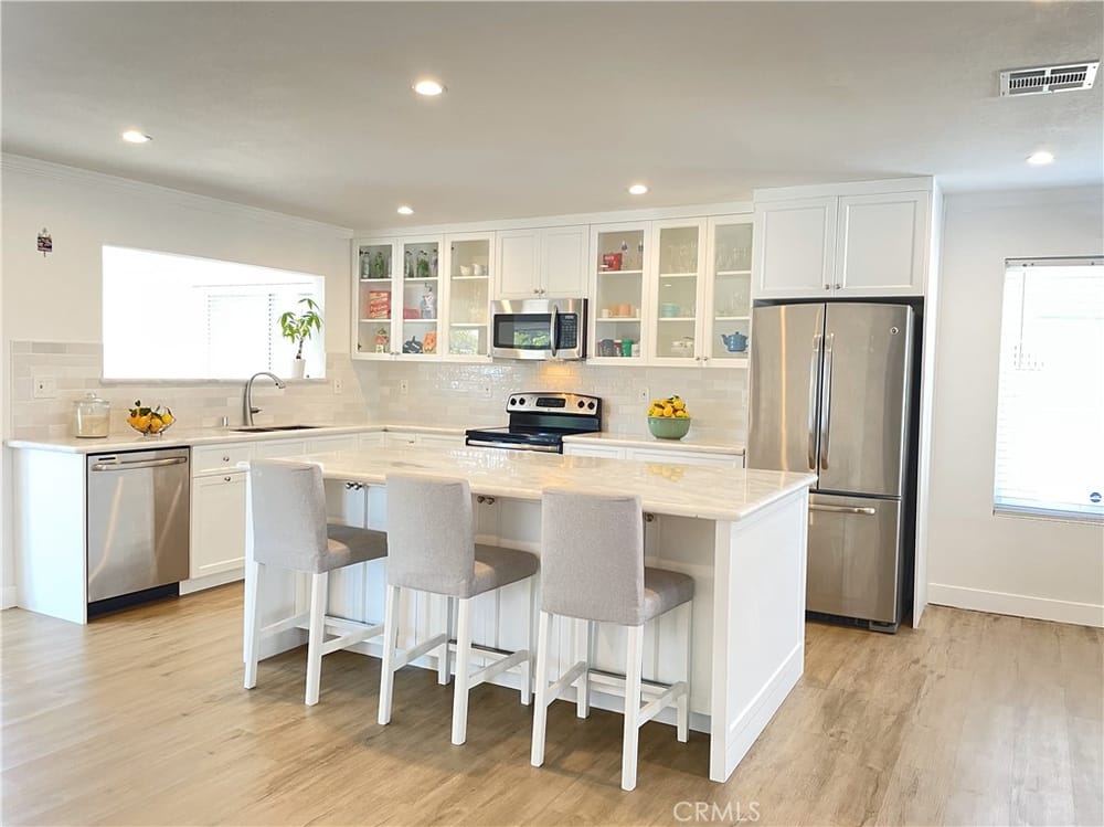 OPPORTUNITY KNOCKS!!! Nestled in this Prime Location of Cerritos with its well-manicured homes and tree lined streets, this Fabulous home boasts both tasteful updates and meticulous attention to detail. The home was extensively remodeled as recently as 2022. Highlights of the Master Bedroom and Bath include an Oversized bathtub with nook, Two Custom Vanities with Natural Quartzite Countertops f...rom South Africa and crystal drawer knobs, Italian Marble Vessel Sink, CB2 Marble sconce lighting, Maria Theresa Chandelier, Oversized Walk-in Closet. The Hallway Bath features Rain shower faucet, Marble Vanity Countertop, Oversized Tiles throughout. Enjoy cooking in the kitchen with its oversized island and surrounding countertops of Natural Quartzite from South Africa, KWC Faucet, Custom kitchen cabinets with glass features for the displaying of fine china or for the avid decorator's creative imagination, as well as extra backsplash throughout the countertops and sink area. The kitchen opens up to the Living room, creating a greater sense of space while promoting intimacy with family members or guests. The living room is also tastefully topped off with a Maria Theresa Chandelier and recessed lighting. The family room exhibits high ceilings, a fireplace. Mandalay style window shutters. Located in the highly sought after ABC School district. Conveniently close to Restaurants, Shopping centers.