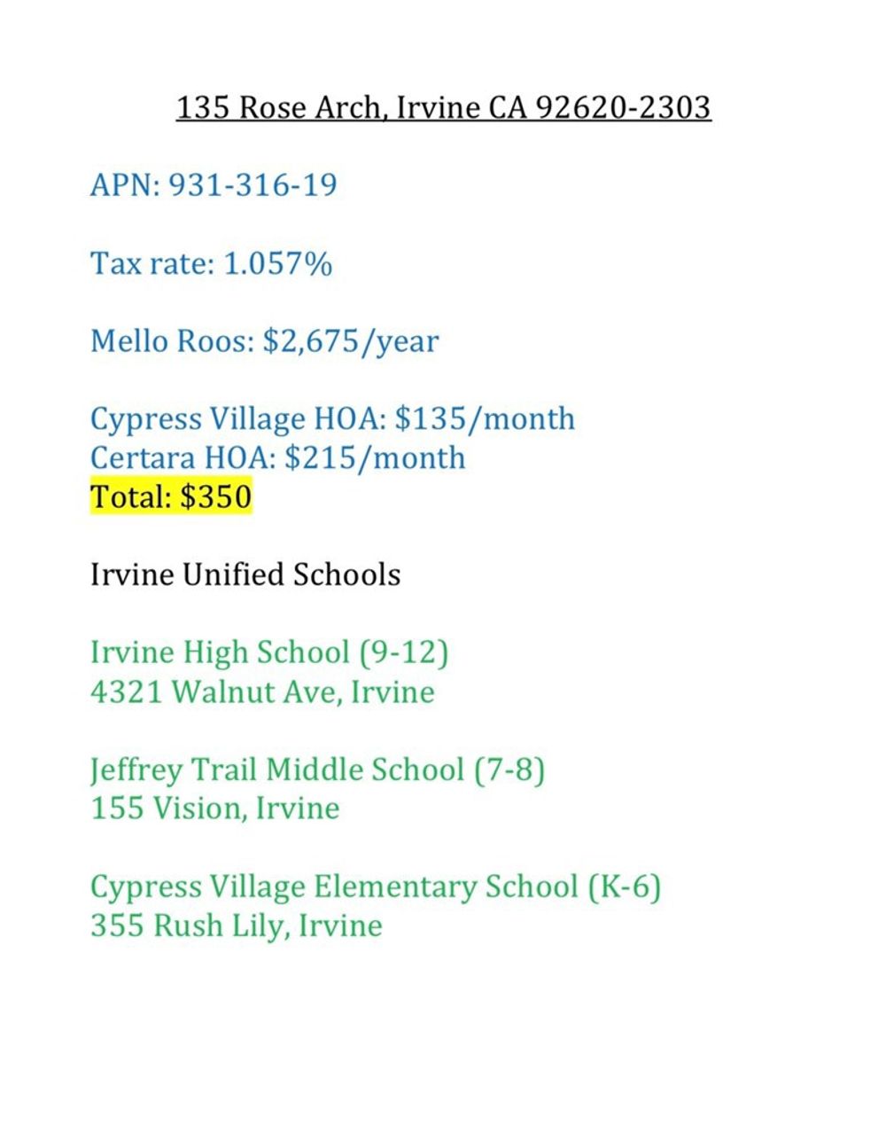 Hãy đắm chìm trong tình yêu sét đánh với thiên đường hiện đại này tại Cypress Village. PHÒNG NGỦ + PHÒNG TẮM ĐẦY ĐỦ Ở TẦNG TRỆT. Đây là ngôi nhà hiếm có với 3 phòng ngủ + 3 phòng tắm đầy đủ tiện nghi có gara để 2 ô tô liền kề. Sàn vinyl sang trọng HOÀN TOÀN MỚI và SƠN NỘI THẤT. Rất nhiều ánh sáng! Nhà bếp bóng bẩy tự hào có một hòn đảo rộng rãi, mặt bàn bằng đá granit, ốp lưng đầy đủ, gói thiết bị Bosch với bếp gas, lò nướng, máy rửa chén và máy hút mùi. Phòng ngủ chính lớn có tủ quần áo lớn. Phòng tắm chính có bồn rửa đôi, vòi sen riêng và bồn tắm. Phòng giặt bên trong ở tầng hai. Máy giặt và máy sấy được bao gồm. Các nâng cấp gần đây bao gồm cửa nhà để xe cách nhiệt HOÀN TOÀN MỚI (2023), thảm mới (2023), đồ chiếu sáng mới trong phòng ngủ và phòng chứa đồ (2024), đèn nhà bếp mới (2024), sơn nội thất tùy chỉnh (2024) và rèm không dây màu trắng (2024). Sân bên hông ít bảo trì với phòng chứa đồ riêng. Phòng chứa đồ bên cạnh sân bên hông cũng có thể được sử dụng làm văn phòng. Sàn nhà mới tinh trong phòng chứa đồ. Irvine Unified. Trường tiểu học Cypress Village nằm gần đó. Cypress Village HOA cung cấp hồ bơi, spa, sân tennis, sân chơi và nhiều công viên đẳng cấp thế giới. Đi bộ đến Jeffrey Trail Open Space, Trung tâm mua sắm Cypress Village và nhiều nhà hàng tuyệt vời. Đường cao tốc 5, đường thu phí 133, Công viên OC Great Park và Bãi biển Laguna đều nằm trong tầm tay. Hãy đến và tận hưởng mùa lễ này tại ngôi nhà tuyệt đẹp này!
