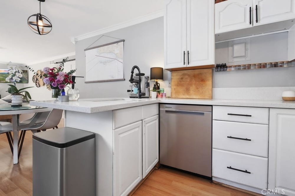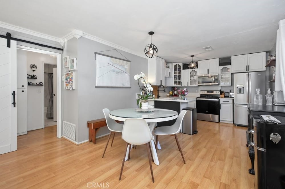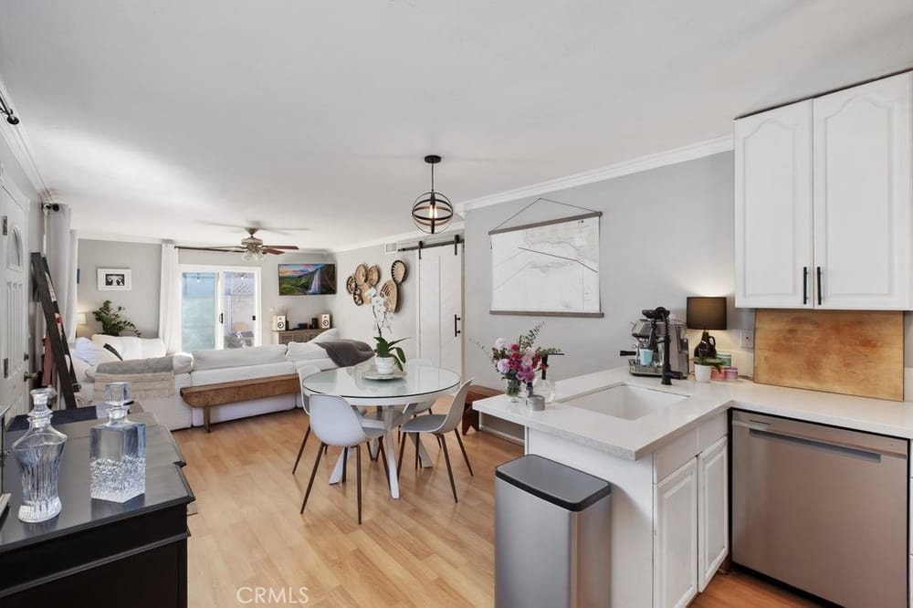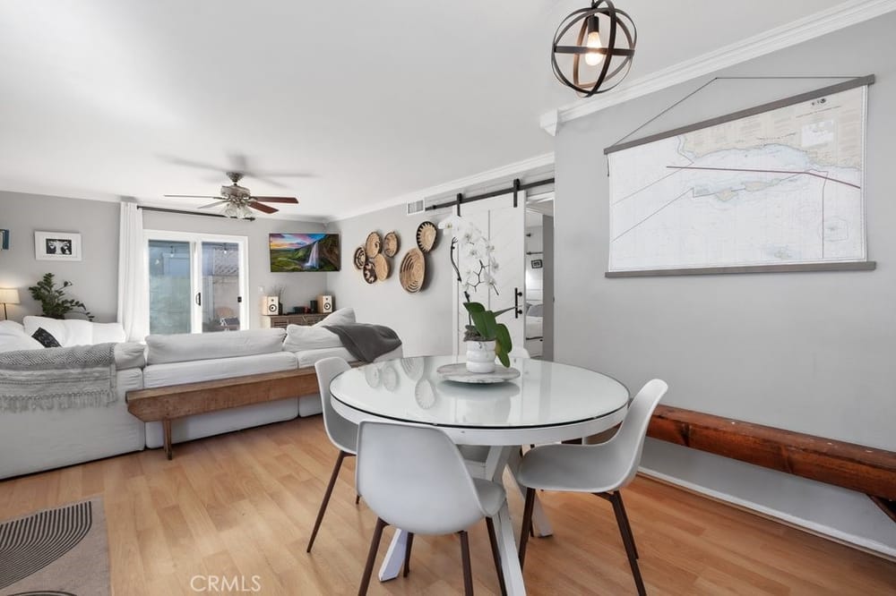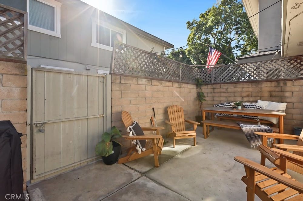 Charming Single-Story Upgraded Condo in the Desirable Harbor Heights Villas in Surf City!Nestled in a prime location in the serene Harbor Heights Villas community, you'll enjoy abundant natural light, a spacious front yard with lush grass, and easy access to guest parking. Upon entering, you’ll be greeted by a bright and open living area featuring gorgeous flooring that flows seamlessly throughou...t the space. Large windows flood the room with natural light, creating a warm and inviting ambiance. The living area opens up to a dining room, ideal for entertaining, and a gourmet kitchen. The kitchen boasts modern white cabinetry, elegant countertops, stainless steel appliances, and sleek light fixtures. The interior design impresses with a sliding barn door leading to the hallway, adding a touch of rustic charm and privacy. The primary suite boasts a spacious layout, mirrored closet doors and a ceiling fan and Air Conditioning for comfort. The secondary bedroom is also generously sized. The bathroom is bright and stylish, completing the home’s modern appeal.A sliding glass door leads you to your private backyard—perfect for enjoying a peaceful morning coffee or evening sunsets. The unit also includes a convenient laundry room located next to the detached garage.Located in the heart of Huntington Harbour, this condo is just minutes away from popular destinations like Trader Joe’s, Harbor Elementary School, and is only one mile from the picturesque Bolsa Chica Beach. Harbor Heights Villas offers residents a variety of amazing amenities, including a sparkling pool,clubhouse, expansive greenbelts, and basketball courts. The community is also near Huntington Harbour, an array of shopping and dining options, as well as PCH, the 405, and 22 Freeways.Don’t miss the opportunity to make this wonderful property your new home!