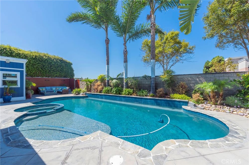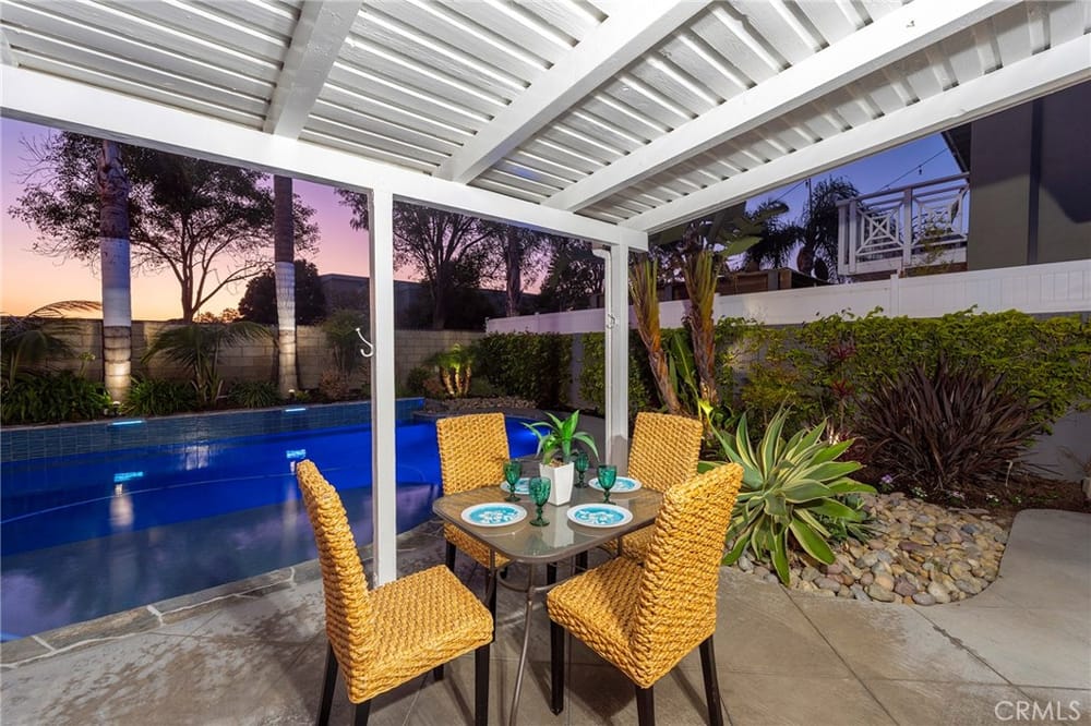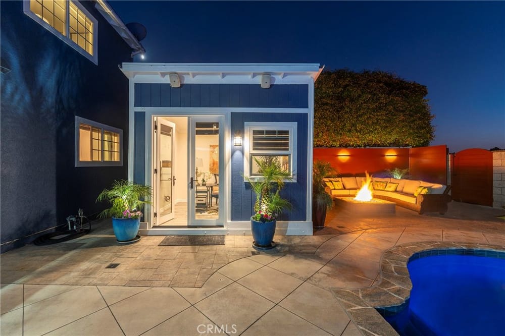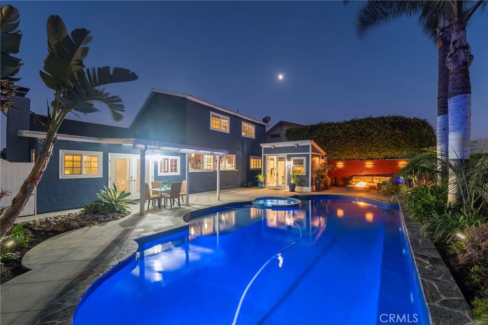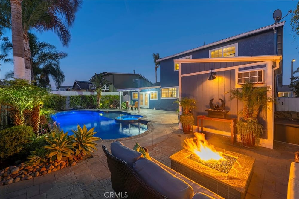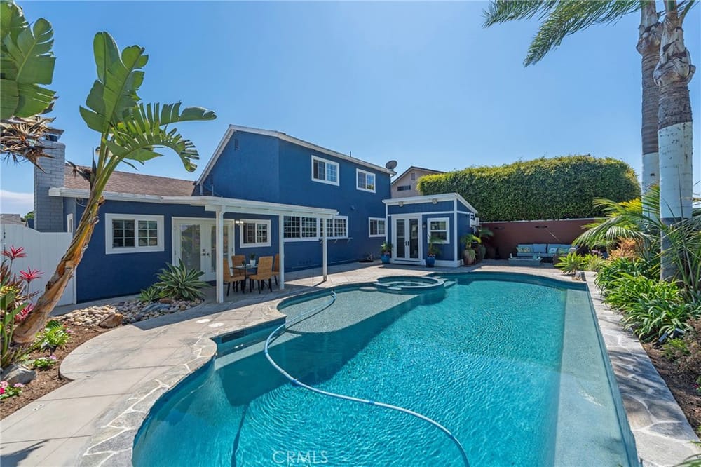HUGE PRICE IMPROVEMENT! 3 bedroom + detached 119 sq. ft. structure (office, game room, pool house). Inside house could be converted to 4 bedroom. Welcome to your personal, private resort that you can call home. Located in a highly coveted neighborhood, award winning schools and within walking distance of the Bolsa Chica wetlands, walking trails that lead to the beach and public workout equipment ...right out your back private gate. Hardwood floors throughout. If you work from home, step out of your detached, private, structure with 8-foot French doors, fully insulated with air conditioning and heating, and wired for inside and outside speakers. Use as an office, game room or pool house. After a hard day’s work, enjoy your oasis backyard, with sparkling 40-foot pool remodeled in 2019 with pebble-tech, 8-foot Baja step, spa and multi-colored pool lights and water decent fountains. Pool and privacy wall lights controlled on your phone through Aqua Link®. The gas fire pit area with a view of the pool and mahogany lighted privacy wall sets the scene for intimate conversations or a gathering with friends and make the stress of the day disappear. Inside watch the sunsets or the kids play while preparing dinner in the remodeled kitchen featuring Samsung black stainless smart appliances with double oven, full-size refrigerator (included), Tommy Bahama tile, and built in dining area. (Dining table included). After a long day, retire upstairs to your primary bedroom retreat with view of HB sunsets and no neighbors behind you. 3 spacious closets and a separate dressing area overlooking the backyard. House recently painted outside and inside. RV parking, epoxy-coated garage floor with extra storage in rafters and cabinets and a workbench add to the extra features of this stunning home. Dual pane, vinyl windows and fenced front yard. Don’t miss this rare opportunity to make this gem your new home.
