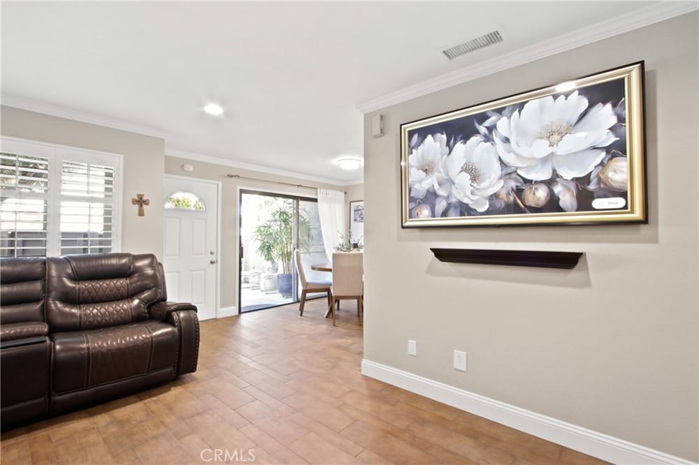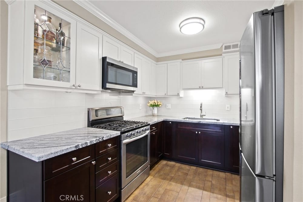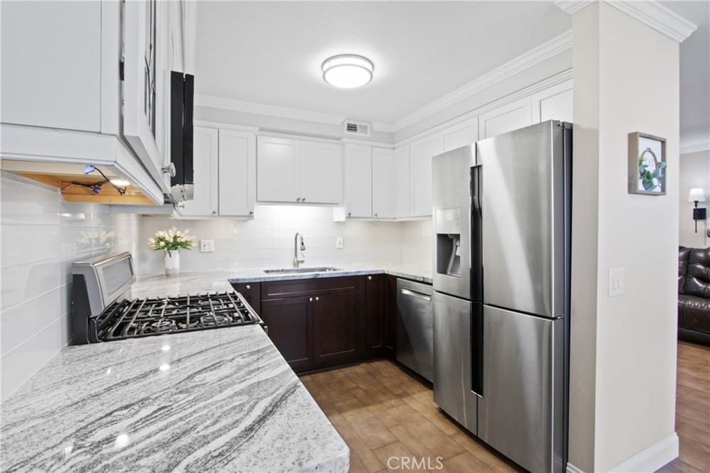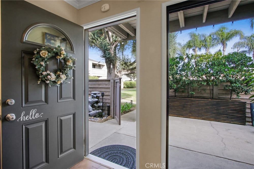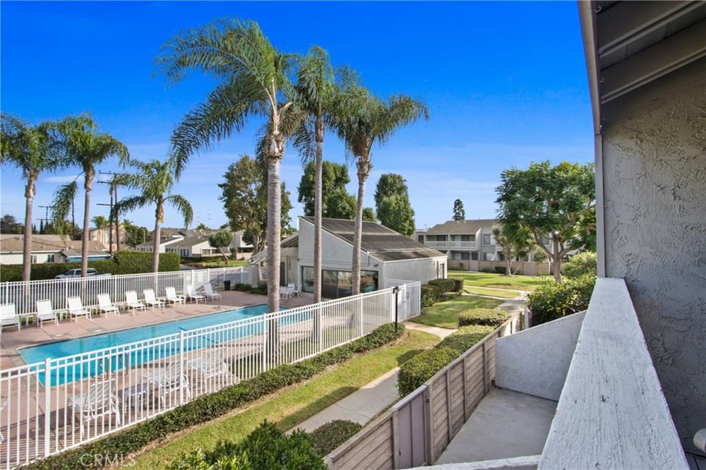 Nestled in the charming Huntington Beach community of Tamarack Village! HIGHLY UPGRADED townhome with a LOW HOA, three-bedrooms, one and a-half-baths, situated nicely within the middle of the community overlooking the pool and clubhouse, with no neighbors in front or behind! This home has been lovingly cared for by the owners for the past 21 years, truly a rare gem waiting for you to discover! Th...e remodeled kitchen (in 2018) is equipped with elegant Viscount white granite counters, 16x4 inch modern white glass back splash, Pro-American recessed shaker style panel cabinets in Java Cherry (lowers) and Linen (uppers) including under lighting, a Kohler stainless sink, five burner KitchenAid gas range with oven, Samsung refrigerator, Bosch dishwasher, and an under mounted microwave above the stove. The dine in kitchen is adjacent to the living room, and a spacious private front enclosed patio connected by a sliding door which makes it perfect for entertaining! Tucked around the back side of the living room is the half bathroom, and the direct access to the garage. All three bedrooms are located on the second level, a nice size primary room with two separate closets (mirrored sliding doors), and a balcony overlooking the pool with expansive views of the community! Across the hall from the primary suite, are the two additional bedrooms. The upstairs bathroom was handsomely remodeled in 2022 includes a Carrara marble vanity, bidet toilet, and a floor to ceiling “marble like” large tiled shower with frameless glass enclosure and a long shelf perfect for all of your toiletries! Other upgrades include: Central AC and heat, a separate 220V outlet for EV charging in the garage, dual pane low e-glass windows, plantation shutters, Gambarelli Atlantis Porcellanato plank tile wood look downstairs and in both bathrooms, crown molding, larger baseboards, dimmable LED recessed ceiling lights, 40 gallon water heater installed in 2023 with a six yr. warranty, diamond cut and polished cement patio slab, and washer and dryer in the garage are included. Residents of this community enjoy the sparkling swimming pool, complimentary use of the clubhouse and green belts! Water and trash are included with the HOA! Just a short four mile drive to Huntington State Beach where the sea meets the sand! This turnkey townhome is a must have!