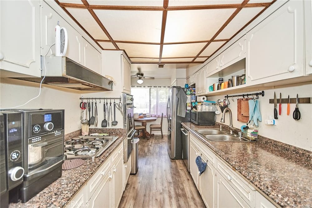 [LAND LEASED] PRICE REDUCTION!!! A compelling opportunity awaits to acquire a spacious single-story condominium in gated community of CASA EMPERADOR. This residence features a converted third bedroom suitable for a den or office space, complemented by a soaring vaulted ceiling and skylight that illuminate the interior. New interior paint and new flooring with throughout luxury vinyl wood. Spacious... living room with a fireplace & skylight and a formal dining area with built-in China Hutch provide ample room for relaxation and entertaining. The kitchen with a cozy breakfast nook. Central air conditioning and enclosed patio in the backyard installed in 2017. Additionally, the property includes two parking spaces—a carport and an assigned spot. Community amenities encompass a pool, tennis court, RV parking, and clubhouse, with HOA dues covering water and trash services. Ideally situated near shopping, dining, schools, and major freeways, this property represents an exceptional value proposition despite needing some tender loving care. Priced competitively for a prompt sale, this offering presents an attractive opportunity for prospective buyers.