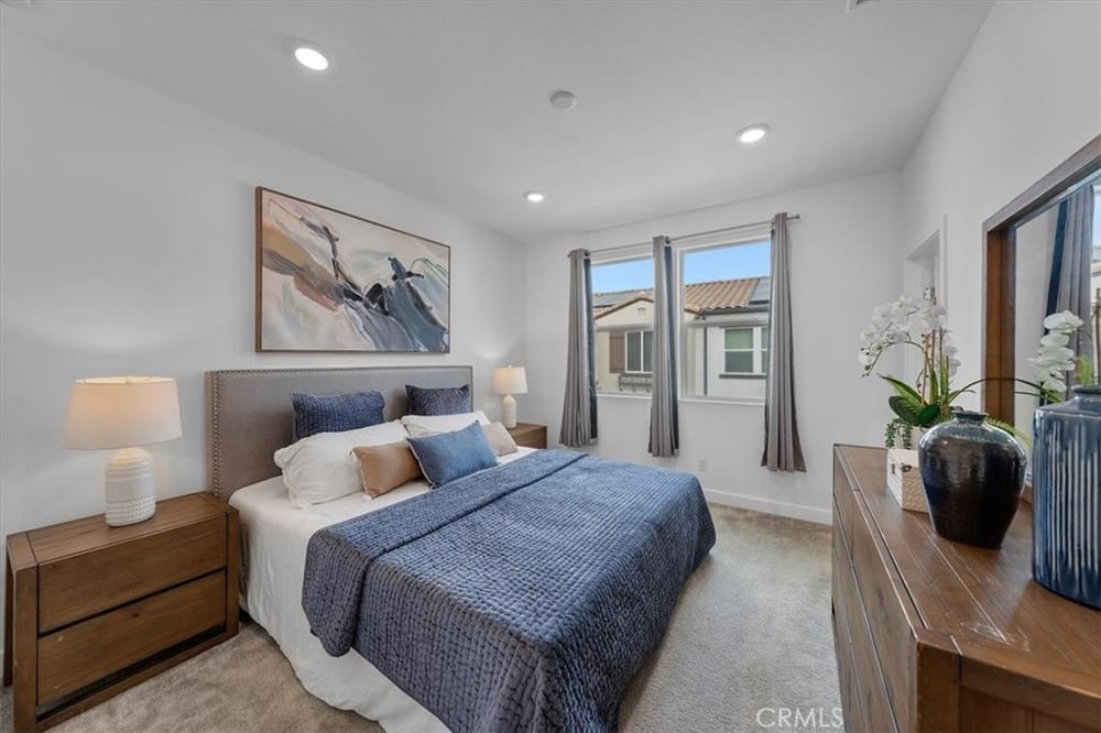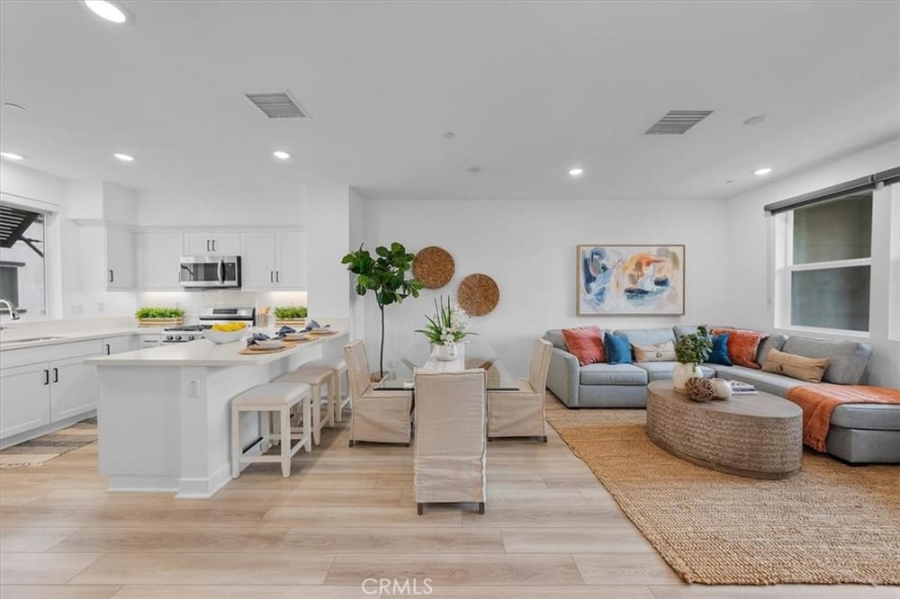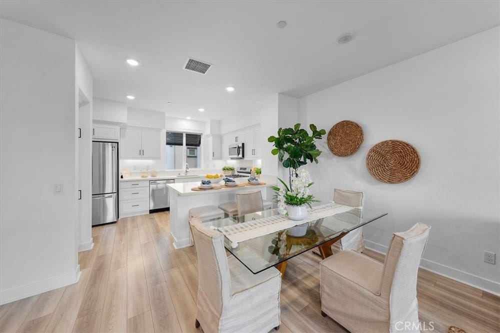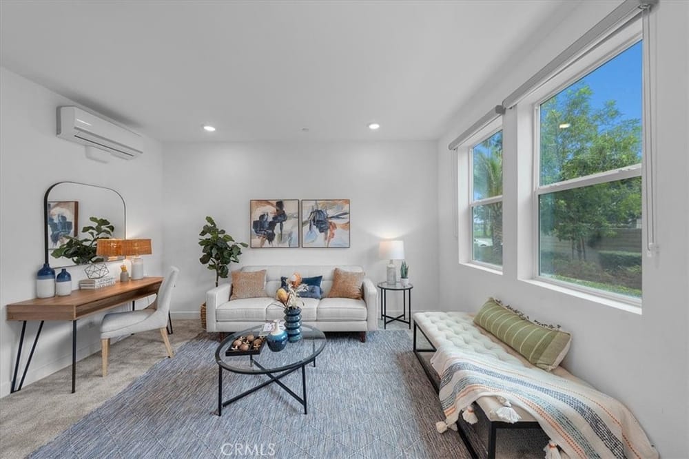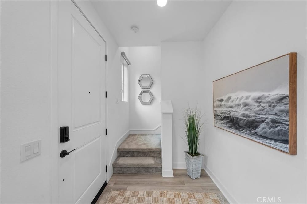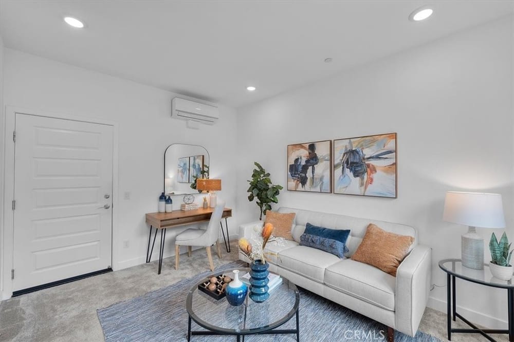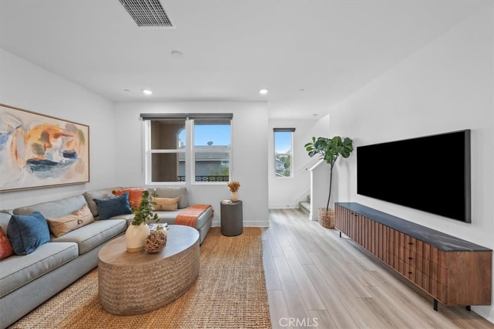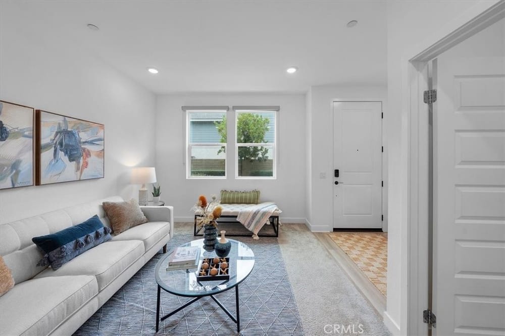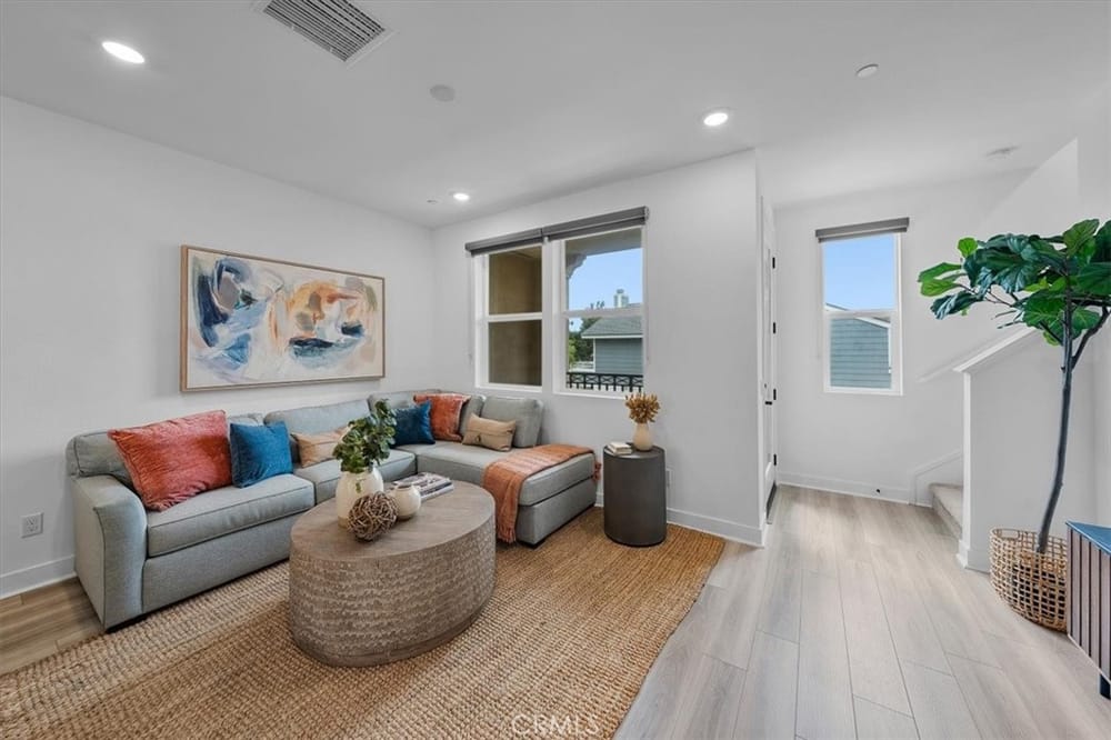Experience modern luxury in this pristine Anaheim townhome, built in 2021 and offering a perfect blend of style, comfort, and functionality. With 1,624 square feet of living space across three levels, this home features two bedrooms, four bathrooms, and a versatile den. Upon entry, you're greeted by a flex space that can serve as a guest room, office, or living area. This level also includes a con...venient half-bathroom and direct access to a finished, two-car side-by-side garage. The second floor opens up to a bright and spacious living area, featuring sleek luxury vinyl plank flooring and an open-concept kitchen with a generous quartz countertop, stainless steel appliances, barstool seating, and pantry. This main level also includes a dining area, half-bathroom, and laundry room with side by side washer and dryer. Step outside to relax and enjoy the balcony. Retreat to the top level, where the two bedrooms await, each with its own ensuite bathroom and walk-in closet. The expansive primary suite offers a spa-like bathroom with dual sinks and tiled shower enclosure. Additional highlights of this modern home include central A/C, tankless water heater, forced air heating, whole house fan, solar panels, and smart home technology. Conveniently located near schools, shopping centers, freeway access, Dad Miller Golf Course, and Knott's Berry Farm, this townhome offers a premier opportunity to enjoy the best of Orange County living!