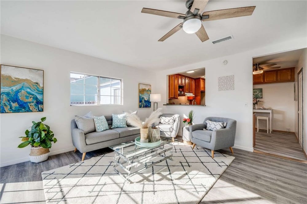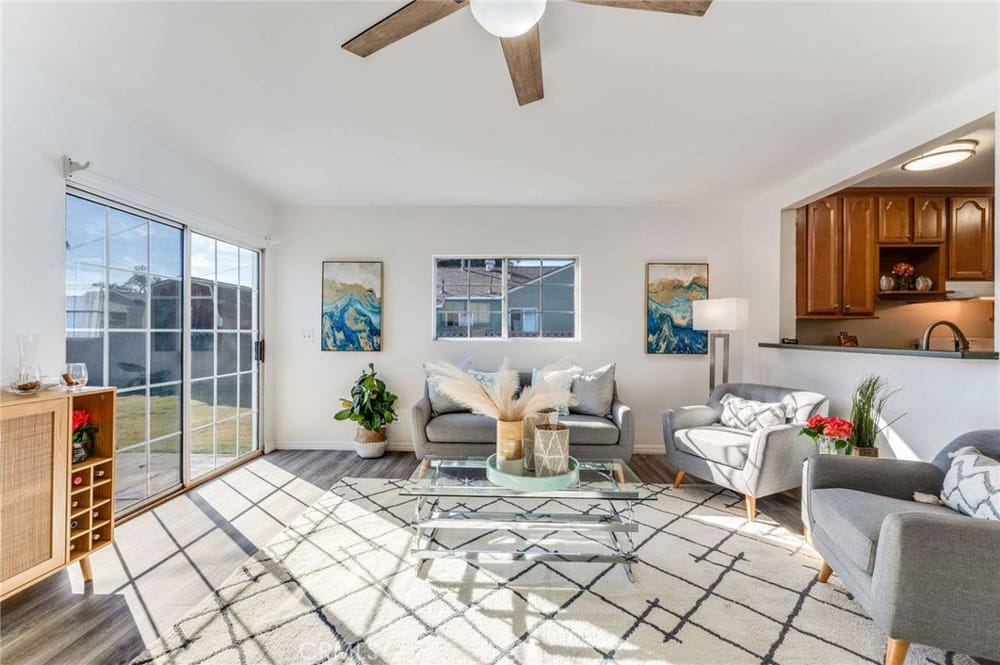 Nestled on a charming, tree-lined street in Lakewood, this beautifully updated home offers inviting curb appeal and modern comforts. A cozy, covered front porch welcomes you inside, where a spacious living area features stylish vinyl plank flooring and abundant natural light streaming through large picture windows. The recently updated kitchen boasts warm, golden wood cabinets, durable Corian coun...tertops, and ample cupboard and counter space, creating a delightful culinary workspace. With an open floor plan, entertaining is a breeze as the kitchen flows seamlessly into the expansive family room. A brick fireplace sets a cozy ambiance here, and sliding glass doors open to the backyard for effortless indoor-outdoor living. This home offers two generously sized bedrooms and a contemporary bathroom with updated fixtures. Enjoy a fully fenced backyard with sturdy brick walls, a concrete patio, and plenty of space for outdoor activities or relaxing. This Lakewood gem combines comfort, style, and functionality in an ideal setting. Stephan Foster and Mayfair are the nearby schools and have excellent scores. Newer central air and heat, pex plumbing, and recessed lighting. One-car garage with a wide driveway. Close to Mayfair Park and Pool, easy freeway access.