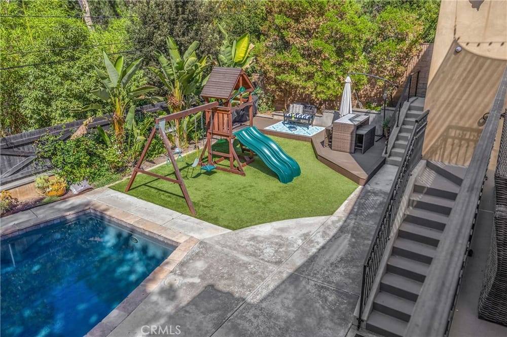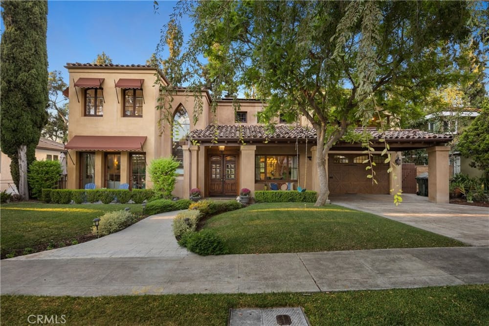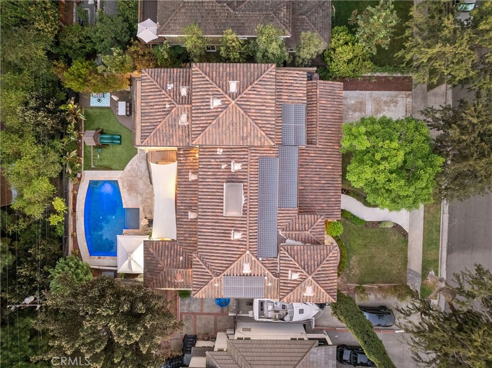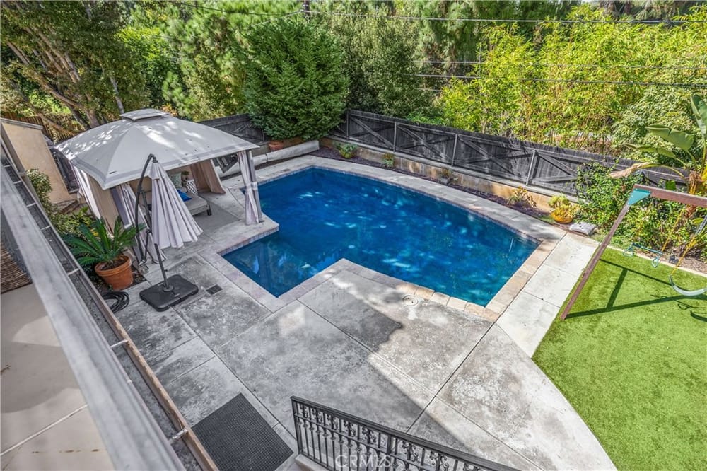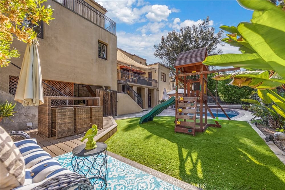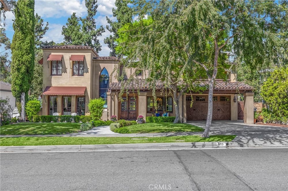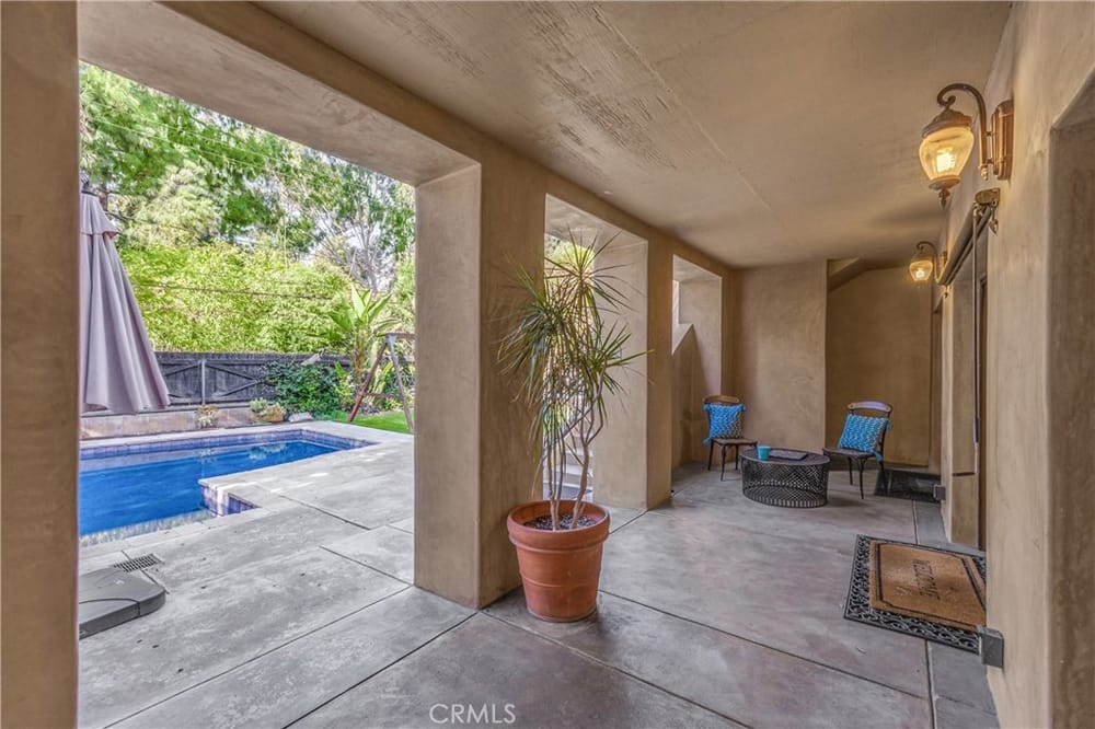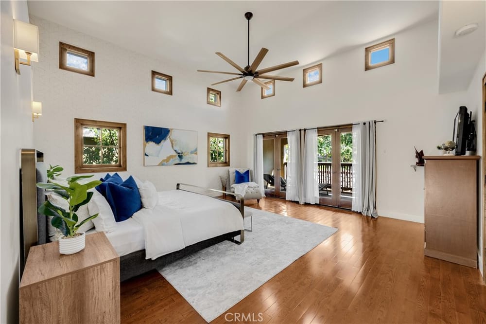 This custom-built European-style home is tucked away on a tree-lined street, blending comfort, style, and practicality. The heart of the home is the gourmet kitchen, featuring a quartz waterfall island, a Viking 6-burner stove, double ovens, and a built-in desk. The kitchen flows into the family room, where French doors lead to a spacious deck overlooking the backyard and pool. The main floor also... includes a formal dining room, a cozy living room with a fireplace, a guest bedroom, and a full bathroom.Upstairs, a loft provides the perfect spot for an office or a TV lounge, complete with a projector. The primary suite boasts 20-foot ceilings, a walk-in closet with custom organizers, and French doors to a private balcony. Its spa-like bathroom features dual vanities, a soaking tub, a glass-enclosed shower, and another private deck with pool views. Another bedroom with it's own bath, plus two more bedrooms, bath and laundry complete the upstairs.The daylight walkout basement offers a versatile space for guests, extended family, or caregivers. It includes a bedroom, kitchen, dining area, game room, theater, storage, and a wine closet. A bathroom with direct pool access adds convenience. With secondary laundry hookups and French doors opening to a covered patio, this level is perfect for entertaining or relaxing by the pool. The backyard is low-maintenance, with artificial turf, a playset, and a deck.Built with concrete blocks for durability and quiet, this home features unique European touches like stained-glass front doors, wrought iron railings, and wood casings. Modern upgrades include dual AC units, a central vacuum, a water filtration system, owned solar panels, and a four-car garage with epoxy flooring, storage, a workbench, and a gym area.Located minutes from downtown Fullerton, this home offers easy access to dining, shopping, top schools, and medical facilities—a blend of elegance, convenience, and lasting quality.