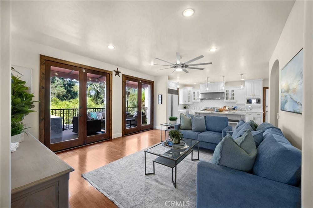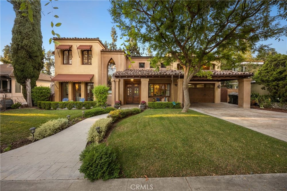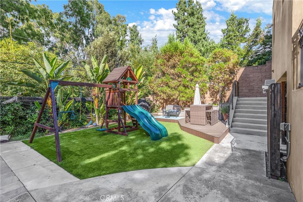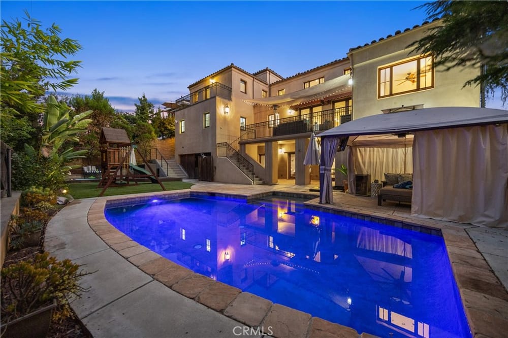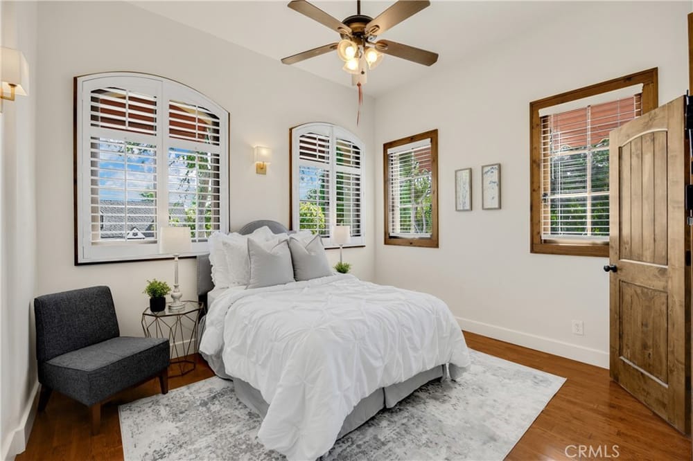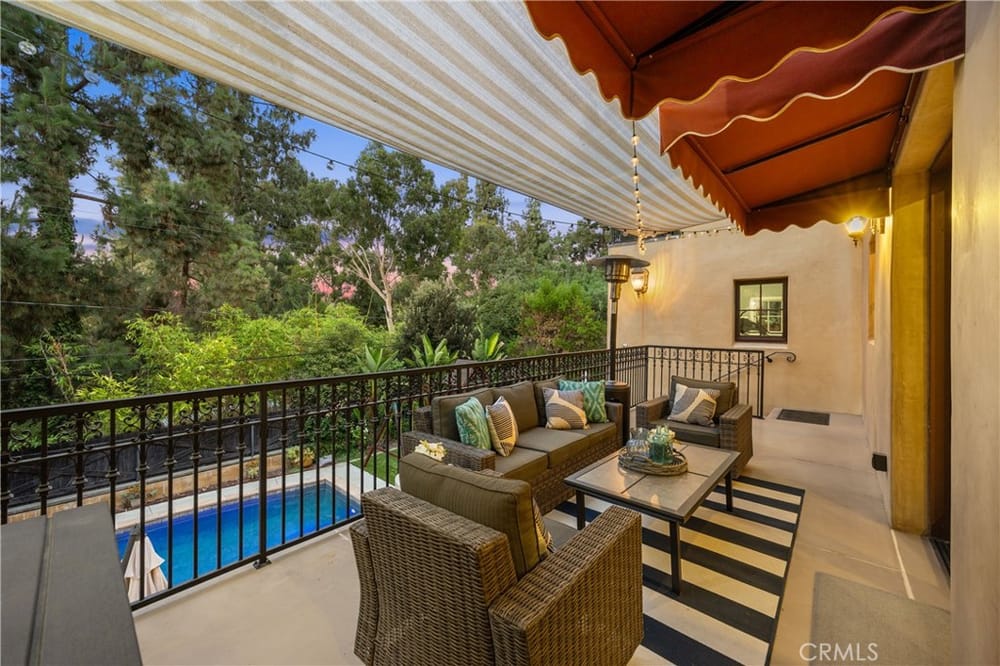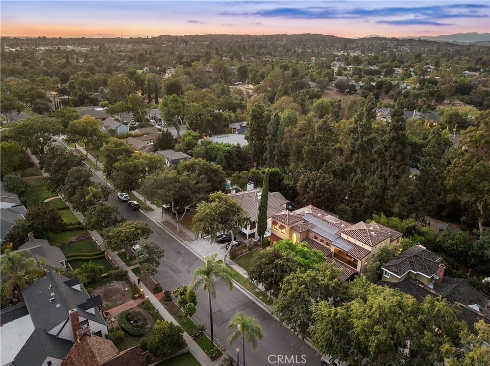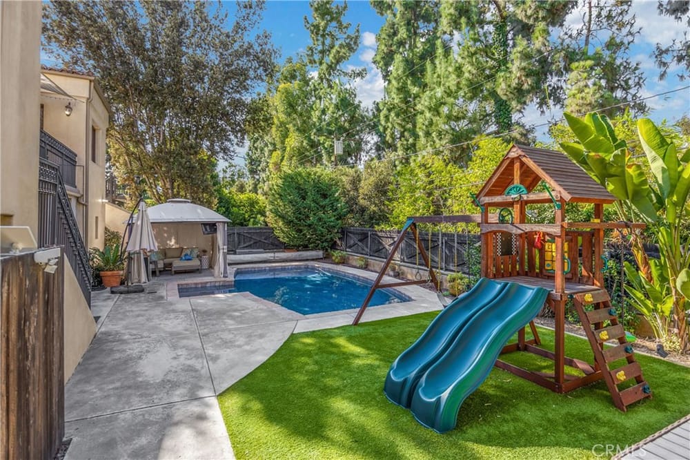 This custom-built European-style home is tucked away on a tree-lined street, blending comfort, style, and practicality. The heart of the home is the gourmet kitchen, featuring a quartz waterfall island, a Viking 6-burner stove, double ovens, and a built-in desk. The kitchen flows into the family room, where French doors lead to a spacious deck overlooking the backyard and pool. The main floor also... includes a formal dining room, a cozy living room with a fireplace, a guest bedroom, and a full bathroom.Upstairs, a loft provides the perfect spot for an office or a TV lounge, complete with a projector. The primary suite boasts 20-foot ceilings, a walk-in closet with custom organizers, and French doors to a private balcony. Its spa-like bathroom features dual vanities, a soaking tub, a glass-enclosed shower, and another private deck with pool views. Another bedroom with it's own bath, plus two more bedrooms, bath and laundry complete the upstairs.The daylight walkout basement offers a versatile space for guests, extended family, or caregivers. It includes a bedroom, kitchen, dining area, game room, theater, storage, and a wine closet. A bathroom with direct pool access adds convenience. With secondary laundry hookups and French doors opening to a covered patio, this level is perfect for entertaining or relaxing by the pool. The backyard is low-maintenance, with artificial turf, a playset, and a deck.Built with concrete blocks for durability and quiet, this home features unique European touches like stained-glass front doors, wrought iron railings, and wood casings. Modern upgrades include dual AC units, a central vacuum, a water filtration system, owned solar panels, and a four-car garage with epoxy flooring, storage, a workbench, and a gym area.Located minutes from downtown Fullerton, this home offers easy access to dining, shopping, top schools, and medical facilities—a blend of elegance, convenience, and lasting quality.