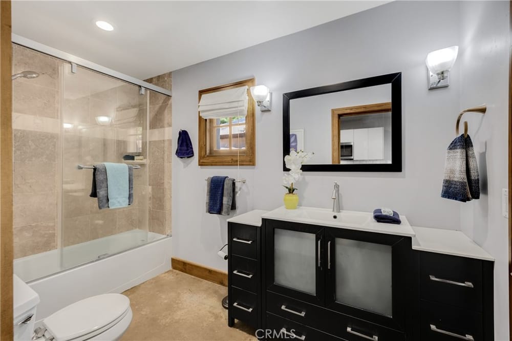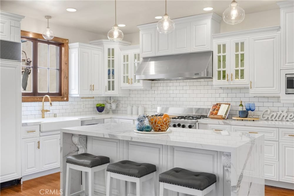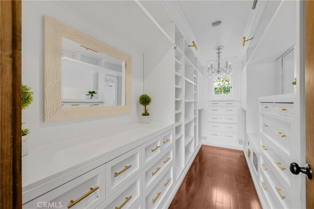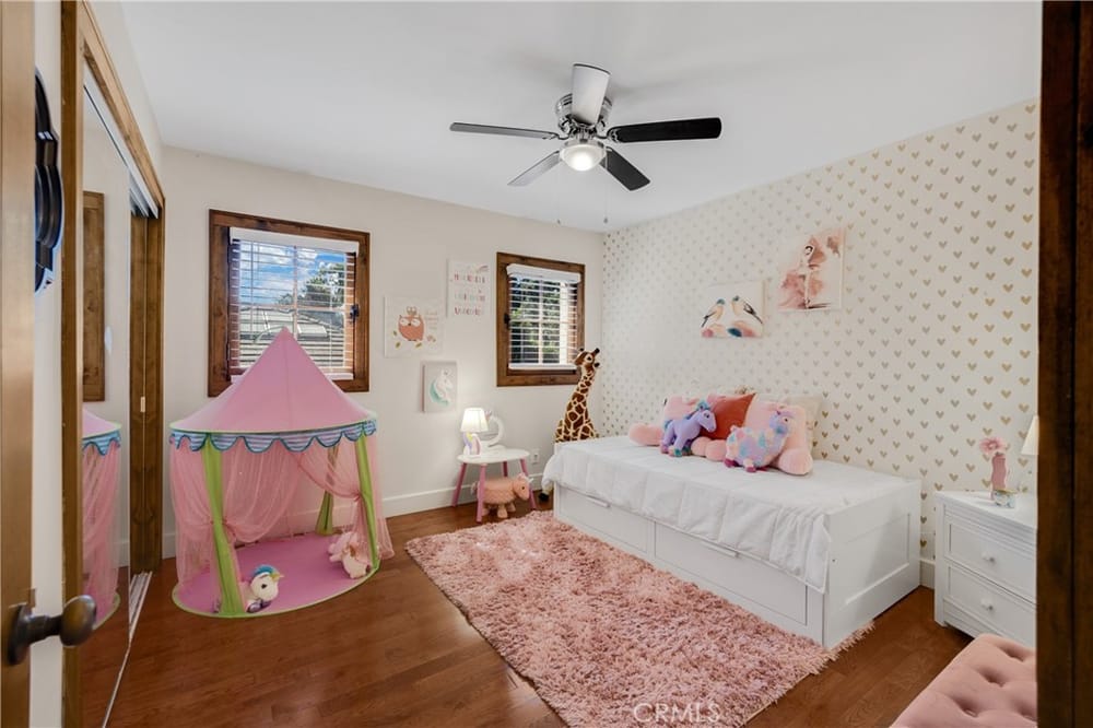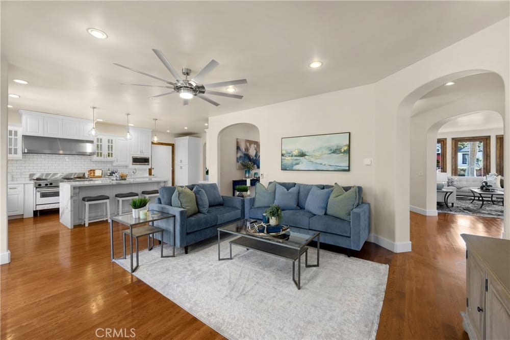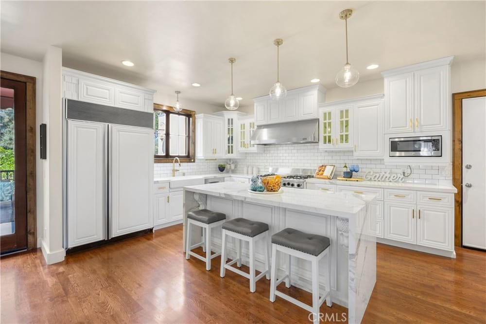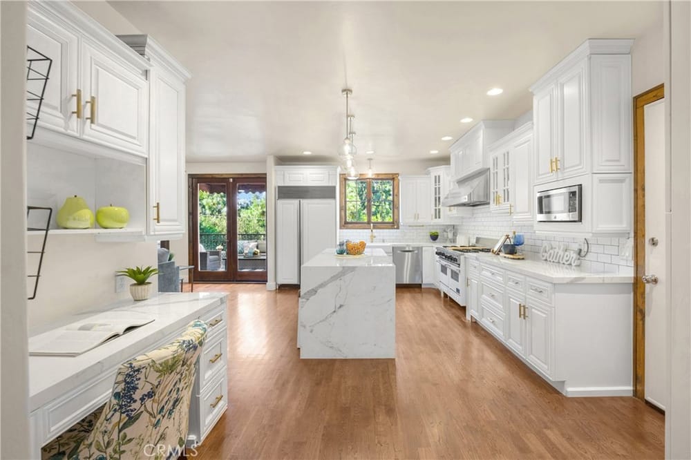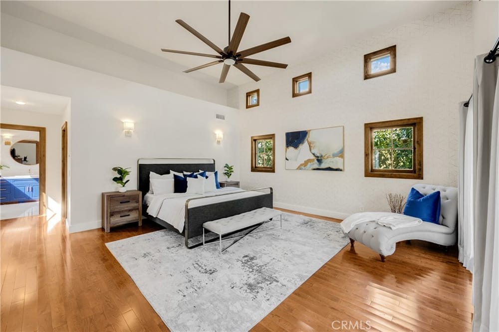 This custom-built European-style home is tucked away on a tree-lined street, blending comfort, style, and practicality. The heart of the home is the gourmet kitchen, featuring a quartz waterfall island, a Viking 6-burner stove, double ovens, and a built-in desk. The kitchen flows into the family room, where French doors lead to a spacious deck overlooking the backyard and pool. The main floor also... includes a formal dining room, a cozy living room with a fireplace, a guest bedroom, and a full bathroom.Upstairs, a loft provides the perfect spot for an office or a TV lounge, complete with a projector. The primary suite boasts 20-foot ceilings, a walk-in closet with custom organizers, and French doors to a private balcony. Its spa-like bathroom features dual vanities, a soaking tub, a glass-enclosed shower, and another private deck with pool views. Another bedroom with it's own bath, plus two more bedrooms, bath and laundry complete the upstairs.The daylight walkout basement offers a versatile space for guests, extended family, or caregivers. It includes a bedroom, kitchen, dining area, game room, theater, storage, and a wine closet. A bathroom with direct pool access adds convenience. With secondary laundry hookups and French doors opening to a covered patio, this level is perfect for entertaining or relaxing by the pool. The backyard is low-maintenance, with artificial turf, a playset, and a deck.Built with concrete blocks for durability and quiet, this home features unique European touches like stained-glass front doors, wrought iron railings, and wood casings. Modern upgrades include dual AC units, a central vacuum, a water filtration system, owned solar panels, and a four-car garage with epoxy flooring, storage, a workbench, and a gym area.Located minutes from downtown Fullerton, this home offers easy access to dining, shopping, top schools, and medical facilities—a blend of elegance, convenience, and lasting quality.
