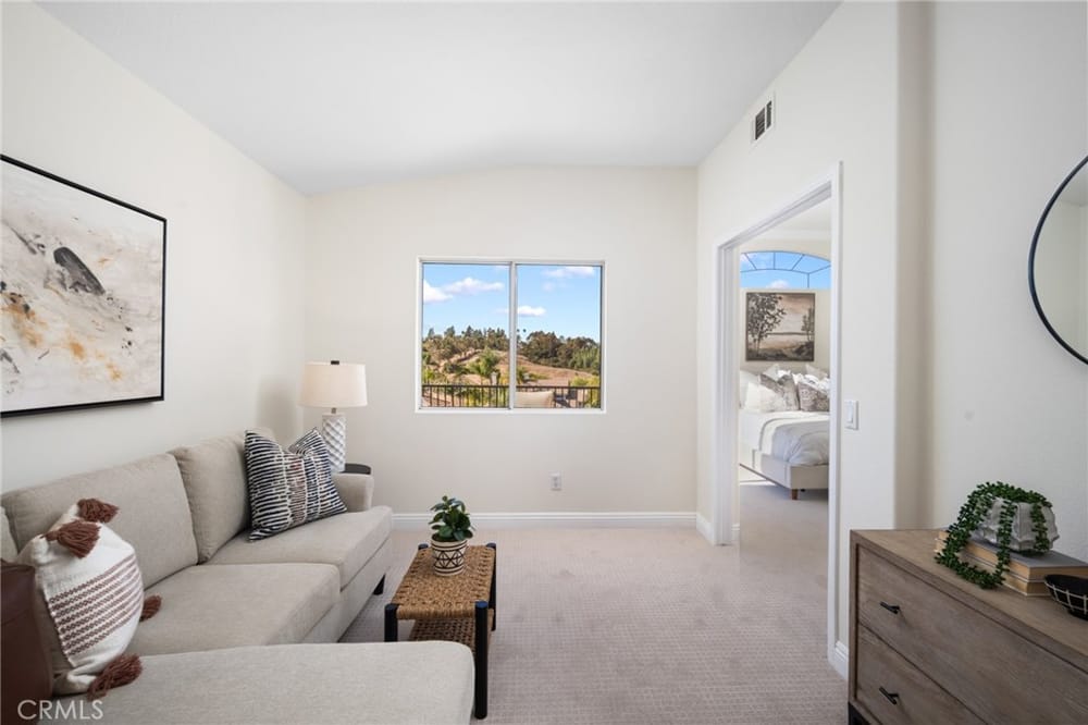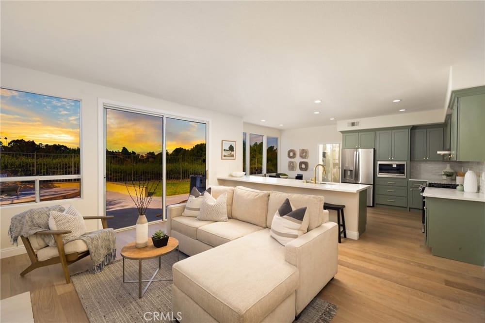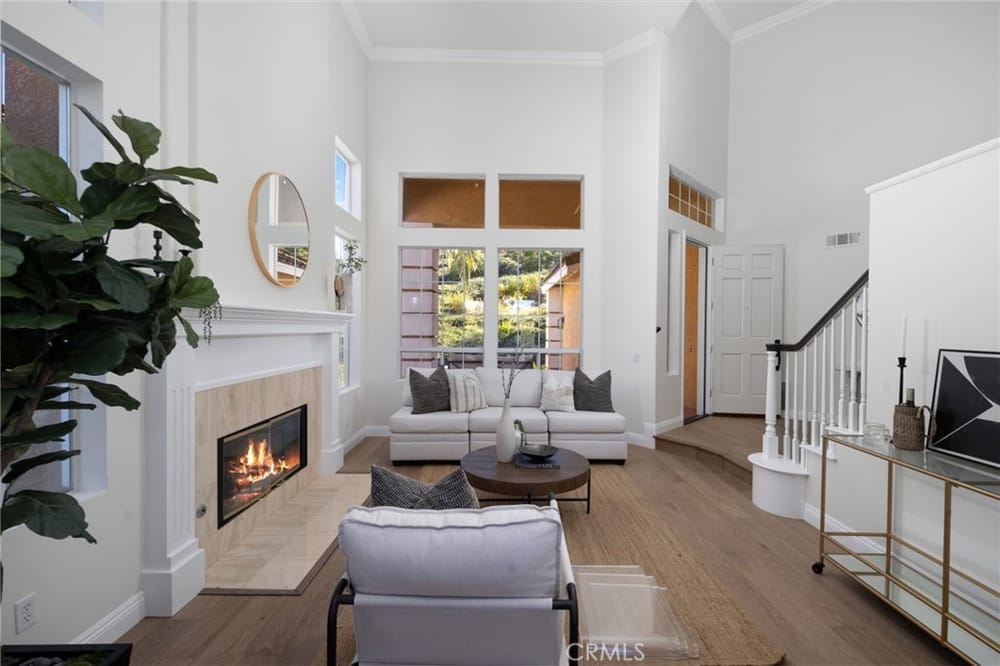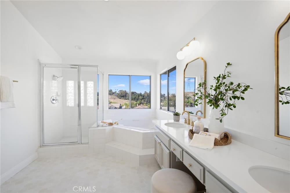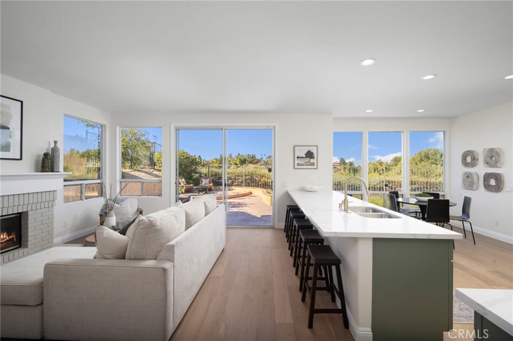 Panoramic views, new updates including a gourmet kitchen, a main floor bedroom with full bathroom, and an oversized primary retreat, set this home apart. This sprawling, newly renovated, 4 bedroom, 3 bathroom, view-home, has just been reimagined with beautiful engineered hardwood flooring, fresh paint, a brand new kitchen, bathroom updates, new lighting, new baseboards and new low pile carpet upst...airs. Natural light pours into the airy living room, accentuated by soaring ceilings, fireplace and a grand staircase.The brand new chef’s kitchen, framed by the captivating hillside views, showcases new cabinets, elegant quartz countertop, custom backsplash, giant island peninsula, new stainless-steel appliance package, new sink and faucet, and designer cabinet pulls. The picturesque views from the dining room create the perfect backdrop for dinner parties, holiday soirees or serene evenings at home. The spacious family room is complete with cozy fireplace and views of the yard and hills. Rounding out the first floor, a main floor bedroom with full bathroom, makes for an ideal office or guest room. Upstairs, the oversized primary retreat has an additional loft area, ideal for an office, workout space or nursery, and it’s own private balcony showcasing stunning views. The primary retreat boasts new carpet, new ceiling fan, two closets including a large walk-in closet, and an oversized bathroom en suite with dual sink vanity, new floor tile, elegant gold hardware, new light bars, mirrors, soaking tub and walk-in shower. Down the hall, two additional bedrooms. The hall bathroom has been updated with designer floor tile, hardware, mirrors, fixtures and light bars. Enjoy watching the sun set from your own private balcony or hosting parties in the low-maintenance backyard, complete with your own citrus trees, framed by picturesque views. There is a spacious main floor laundry area with new tile, cabinets and a sink. Three-car garage with direct access into the home and large driveway. Located within a coveted Anaheim Hills neighborhood, on a single-loaded cul-de-sac street, make this home an idyllic and private location. Zoned to award-winning schools, close to parks, hiking trails, fine dining, shopping and transportation. This peaceful location, paired with breathtaking views, and tasteful updates, is not to be missed.